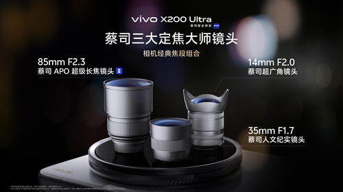 为了打造一款真正的专业创作者出行必备神器,vivo在X200 Ultra上推出了蔡司三大定焦大师镜头——14mm蔡司超广角镜头、35mm蔡司人文纪实镜头和85mm蔡司APO超级长焦镜头II。