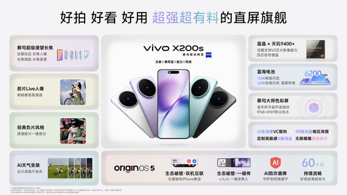 vivo X200s采用了年轻化设计语言和2.5D直屏设计,搭配立边金属中框,握持更舒服。简洁“饼干头”设计,精致且高级。同时提供淡紫、薄荷蓝、直白及简黑四款配色。同时,vivo200s进一步打破了安卓系统与iOS的生态之墙,为双持用户带来了“双机流转”功能,基于该功能,用户可以通过vivo互传实现两台手机之间的来电通知流转、短信流转、通知流转、设备双向查找,再也不用担心错过重要信息,双持如单持,让用户丢掉双持的“麻烦”,尽享愉悦。同时,vivoX200s还支持与iPhone之间进行照片、视频、文件、日程等信息的隔空传和一碰传,帮助用户突破壁垒,分享愉悦生活。